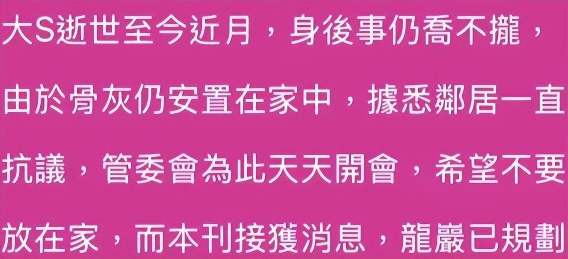 S家对大S后事的办事效率,让很多网友都失去了耐心,关注的人越来越少了。但这段时间大S的邻居可是天天向管委会投诉,抗议骨灰放家里这件事。
