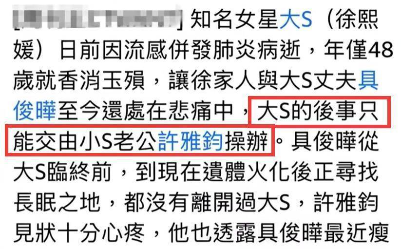 不过目前只是台媒曝出了这个消息,S家人的态度还未可知。不过据说现在大S的后事主要由妹夫许雅钧负责,因为小S和具俊晔已经难过到不能自已了。