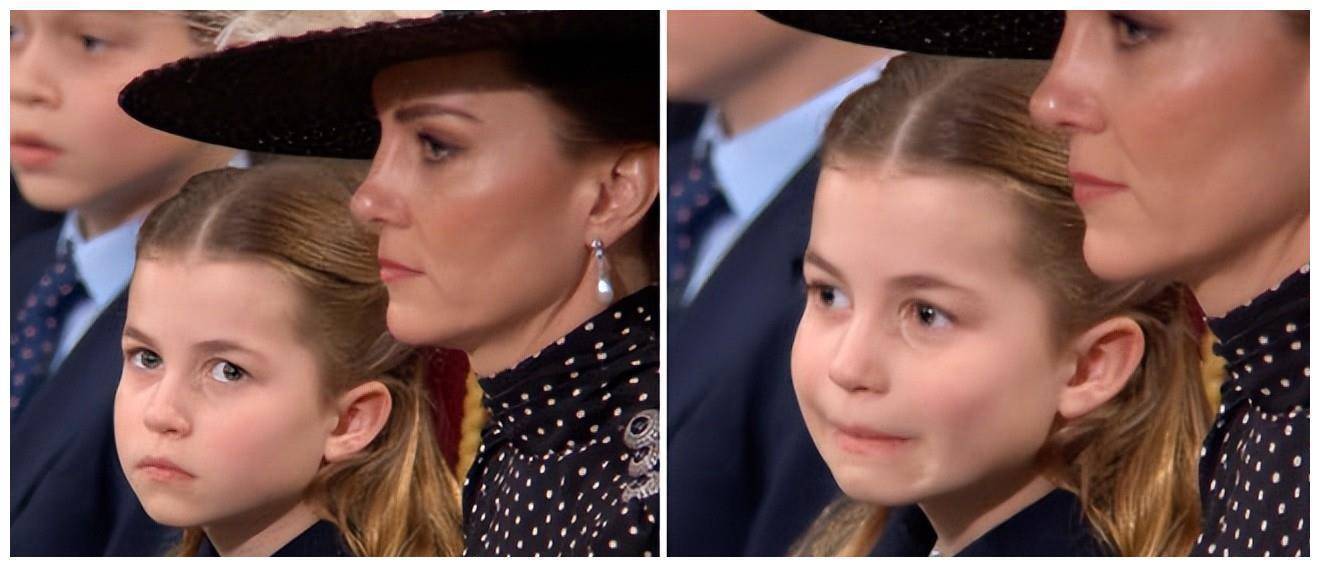前一秒夏洛特公主还很严肃,看到有人在拍她,她下意识地调整了自己的表情,看上去她非常震惊,可她的第一反应好像是,惊吓得想要张开嘴巴,却故作镇静,突然紧紧的闭上了嘴巴;又或许是她想要挤出一丝微笑,可变成了鬼脸。