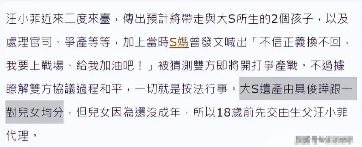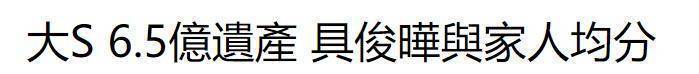 大S价值6.5亿的巨额遗产,可以说具俊晔和两个孩子共同拥有,但因为儿女没有成年,所以在18岁之前由父亲汪小菲代理。