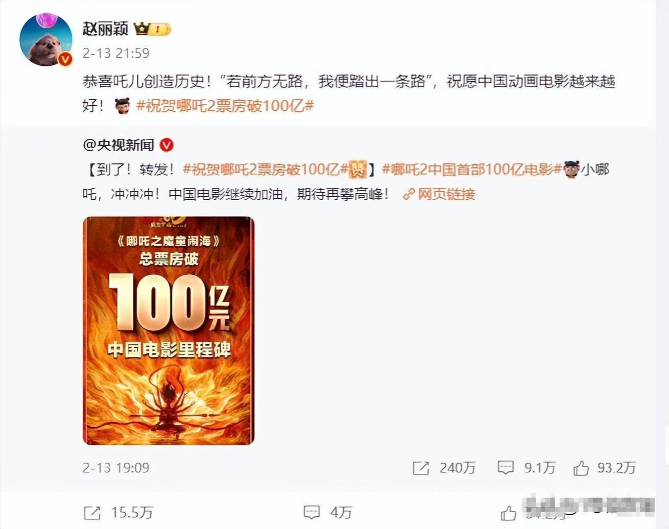 这次第二部即将上映时她更是特意和两个动漫人物合影,在第二部破百亿时特意转发祝福。