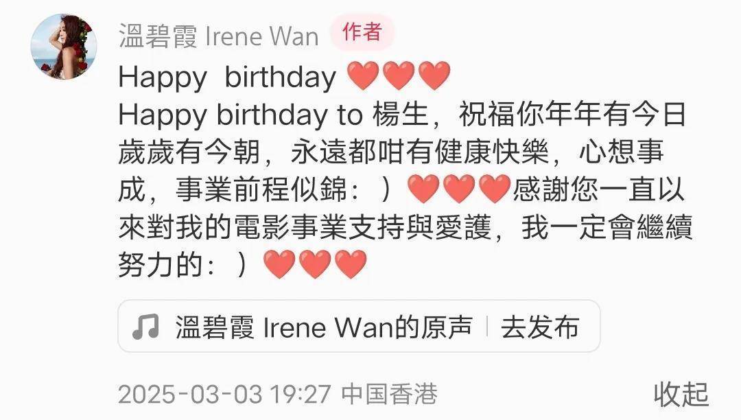 转眼间,就到了杨受成83岁的生日。这天,温碧霞特意准备了一个精美的生日蛋糕,和其他朋友一起为他庆生。她在社交账号上发文,祝福杨受成生日快乐,字里行间都透露着对这位老友的深深敬意和祝福。
