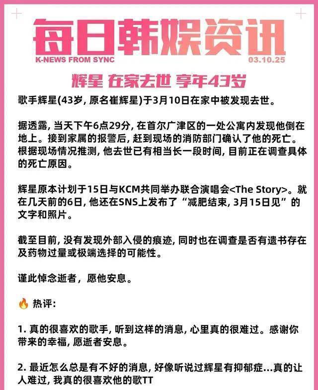 辉星的离世也给韩国乐坛带来了深刻的反思。作为公众人物,他们承受着巨大的压力和期望,他们的每一个举动都可能被无限放大和解读。这种压力,有时候可能会让他们感到无所适从,甚至产生一些消极的念头。因此,我们应该更加关注和理解他们的内心世界,给予他们更多的支持和关爱,让他们能够在音乐的道路上走得更远、更稳。