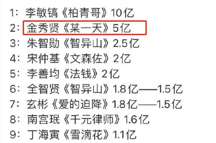不过是7个亿的韩币,换算成人民币差不多300多万,这笔钱对于普通人来说,的确是一笔不菲的数目,可对于金秀贤来说,不过是手指头缝缝里流出来的小数目而已,根据韩国媒体报道,金秀贤光是一部戏的片酬,就已经高达5个亿了,那就是200多,差不多300万,在韩国演员片酬排行榜上,都是名列前茅的。