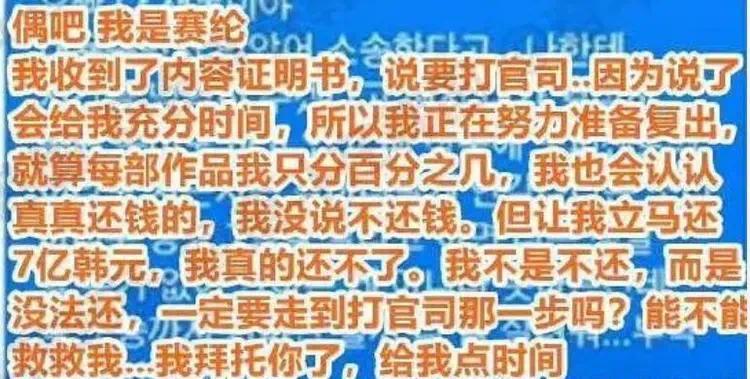 而她与公司的债务,还得从一场酒驾说起,性格单纯的她,因为生活的压力,难免会借酒消愁,谁能想到,酒精的麻痹,竟让她直接断送了自己的演艺生涯, 当时是公司替她承担了债务,为此金赛纶还特意感谢了一下自己的欧巴,然而这场感激换来的,竟是变相的催债,身无分文的她,只能向金秀贤求助,短信中的那一声声“救救我”,别提让人有些心酸了。