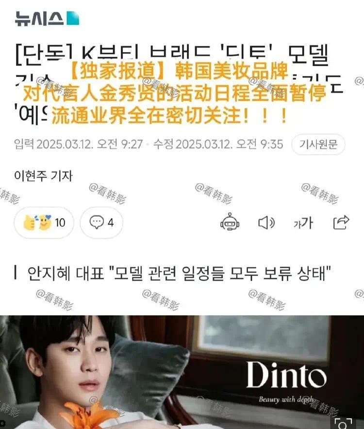 韩国美妆产品dinto开始全面暂停代言人金秀贤日程,目前业界内密切关注中。Dinto方面表示:“全体职员一起确认了事实关系,讨论了应对方向”,现在与其相关的计划日程处于保留状态。