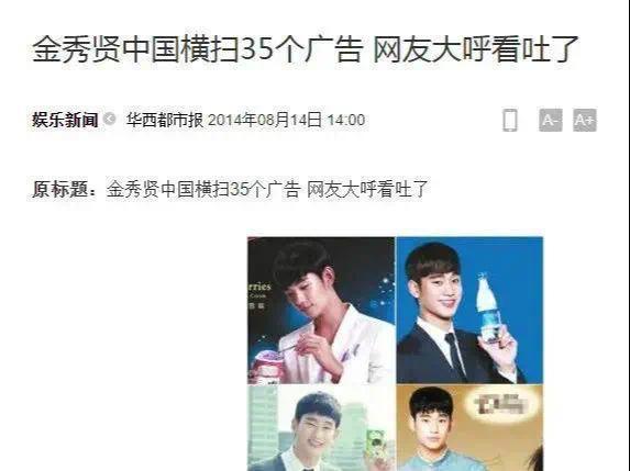 那段时间,正是韩流在我国最旺盛的时候,2014年金秀贤在我国接了35个广告,赚了5个亿。