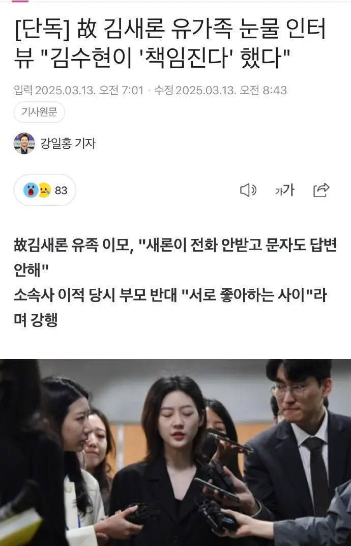3月13日,韩媒公开与金赛纶姨母的对话,对话中金赛纶的姨母称7亿是《猎犬》的赔偿金,虽然是公司代为偿还,但金赛纶有说过这是金秀贤个人借的钱。姨母透露父母曾反对金赛纶签约金秀贤公司,但金赛纶表示两人是特别相爱的关系,当时金秀贤也说“我都会负责的,请不要担心”,安抚了父母。但在父母立场看来,虽然是很出名的演员,但因为年龄差距太大,不得不担心。