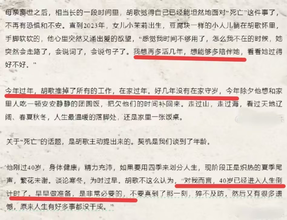 有了孩子后,胡歌操心的事更多,精气神就不如当年了,他曾说40岁已经进入生命倒计时,他对死亡的思考没有停止,从小学二年级开始就在想,出了车祸后又有不同的认知,现在享受亲子时光,总觉得时间不够用,过年都推掉了所有的工作,专心陪伴家人。