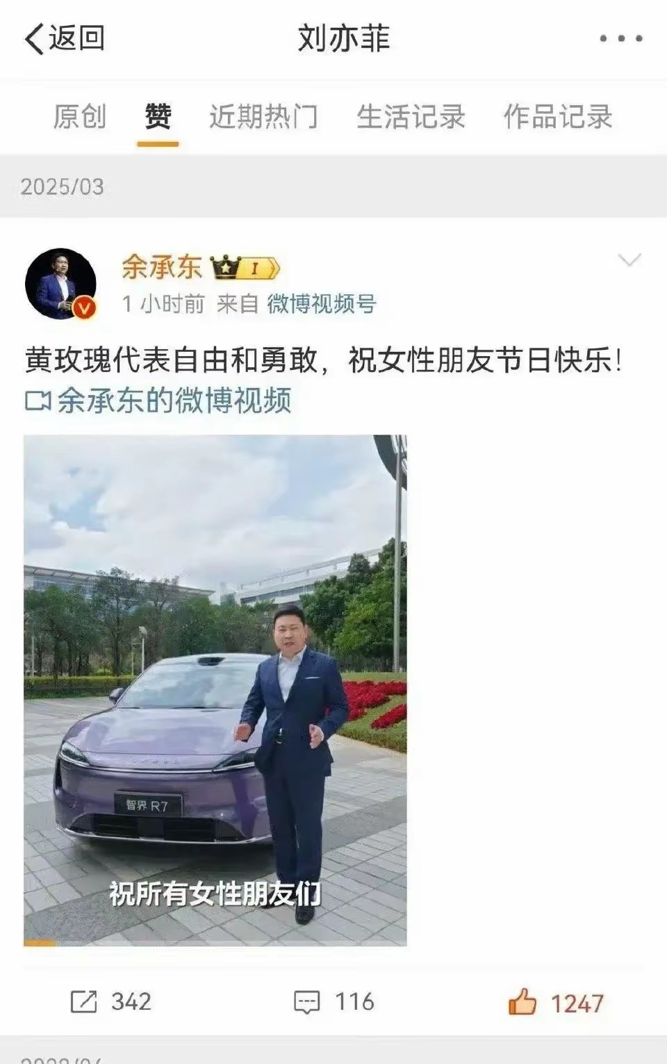而这段恋情被疯传的原因更起始于,刘亦菲和余承东的突然互关。余承东还在妇女节这天,在自己的个人社交平台上,发布了一条关于“黄玫瑰”的视频。视频文案是:“黄玫瑰代表自由和勇敢,祝女性朋友节日快乐”,而配图中他宣传自家公司的汽车上,更是插满了黄玫瑰。