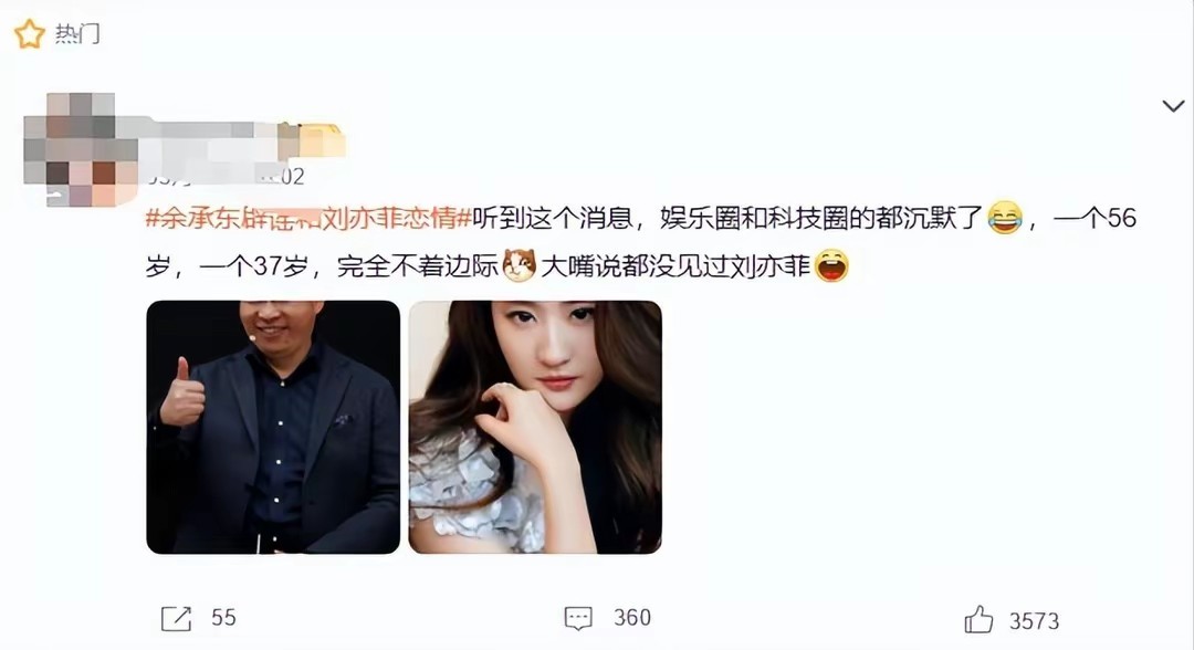 而余承东作为华为的常务董事长,一个实实在在靠着技术打拼出来的工科人才,居然会和女明星传出恋情,甚至还是八竿子打不着的刘亦菲。而且年龄上也不相符,余承东比刘亦菲大了整整19岁,甚至余承东的孩子都已经上了大学,简直匪夷所思。