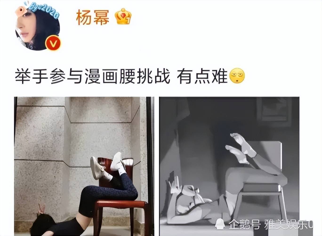 不过,除了利用医美变瘦之外,杨幂还会参加一些挑战,比如当时火爆半边天的“漫画腰挑战”,据说是需要参与者需将大腿放在椅子上、小腿翘起、上半身趴在地上,腰和胸之间要向后折接近 90 度,以此展示腰肢的柔软度与纤细程度。