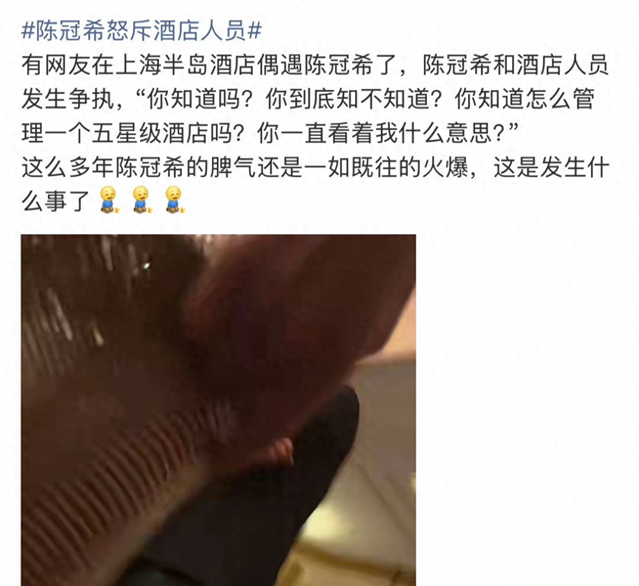 10月16日傍晚,上海半岛酒店大堂的水晶灯还未亮起,一阵急促的质问声已打破了奢华空间的静谧。“你知道吗?你到底知不知道?你知道怎么管理一个五星级酒店吗?你一直看着我什么意思?”45岁的陈冠希手指向对面的工作人员,情绪激动到脖颈泛红,周围旅客纷纷驻足拍摄,这段15秒的视频当晚便让#陈冠希怒斥酒店人员#话题冲上热搜榜首。