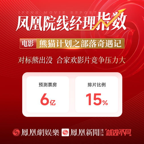 2月17日,由许宏宇执导,熊猫胡胡、成龙、马丽、乔杉、于洋等主演的电影《熊猫计划之部落奇遇记》将上映。凤凰网娱乐“凤凰院线经理指数”集结全国多位一线电影院线工作者,对该片进行票房预测。院线经理点评该片:对标熊出没,合家欢影片竞争压力大。预测该片最终票房为6亿,排片比例预计为15%。
