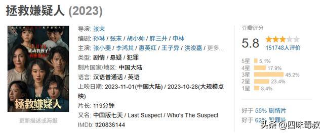 2023年11月1日,电影《拯救嫌疑人》上映,最终拿下5.69亿票房,但口碑一路走低,豆瓣评分仅5.8。除了张小斐演的“妈妈”确实赚了一波眼泪,导演张末也招来不少议论。