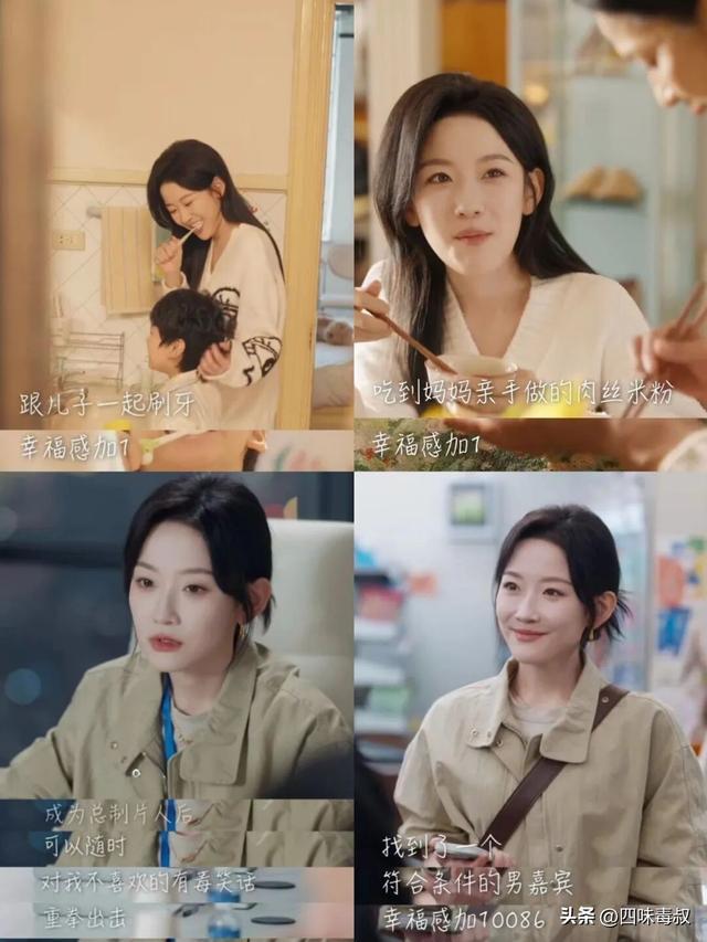 跟儿子一起刷牙,幸福感+1;吃到妈妈亲手做的肉丝米粉,幸福感+1;一次完美的倒车入库,幸福感+1,这些都是生活中的幸福。最让女主感到幸福的事,来自于事业,比如对自己不喜欢的职场有毒笑话,重拳出击,幸福感再+1;为自己的项目找到了一个合适的男嘉宾,幸福感+10086。