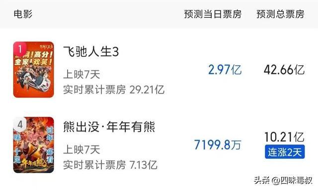 今年春节档从票房分布来看,依然体现出“合家欢”喜剧+动画的市场消费特性。《飞驰人生3》以IP续作+沈腾的票房号召力+赛车奇观牢牢抓住家庭观影群体,目前猫眼预测该片票房将达42亿。《熊出没·年年有熊》同样凭借IP稳定性,预测将收割超10亿票房。