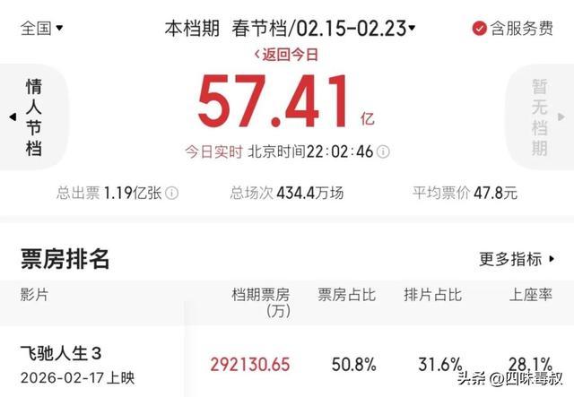 2026年春节档(2月15日—2月23日)拥有9天的投放时段,但真正计算电影实际票房应以2月17日(大年初一)各影片上映开始统计。与2025年春节档狂揽95.1亿票房相比,今年春节档总票房(截至发稿)已收入57亿。其中《飞驰人生3》独占半壁江山。近乎腰斩的数字背后,是总量萎缩、结构分化,以及春节档观众“先看评分再购票”的消费习惯使然。