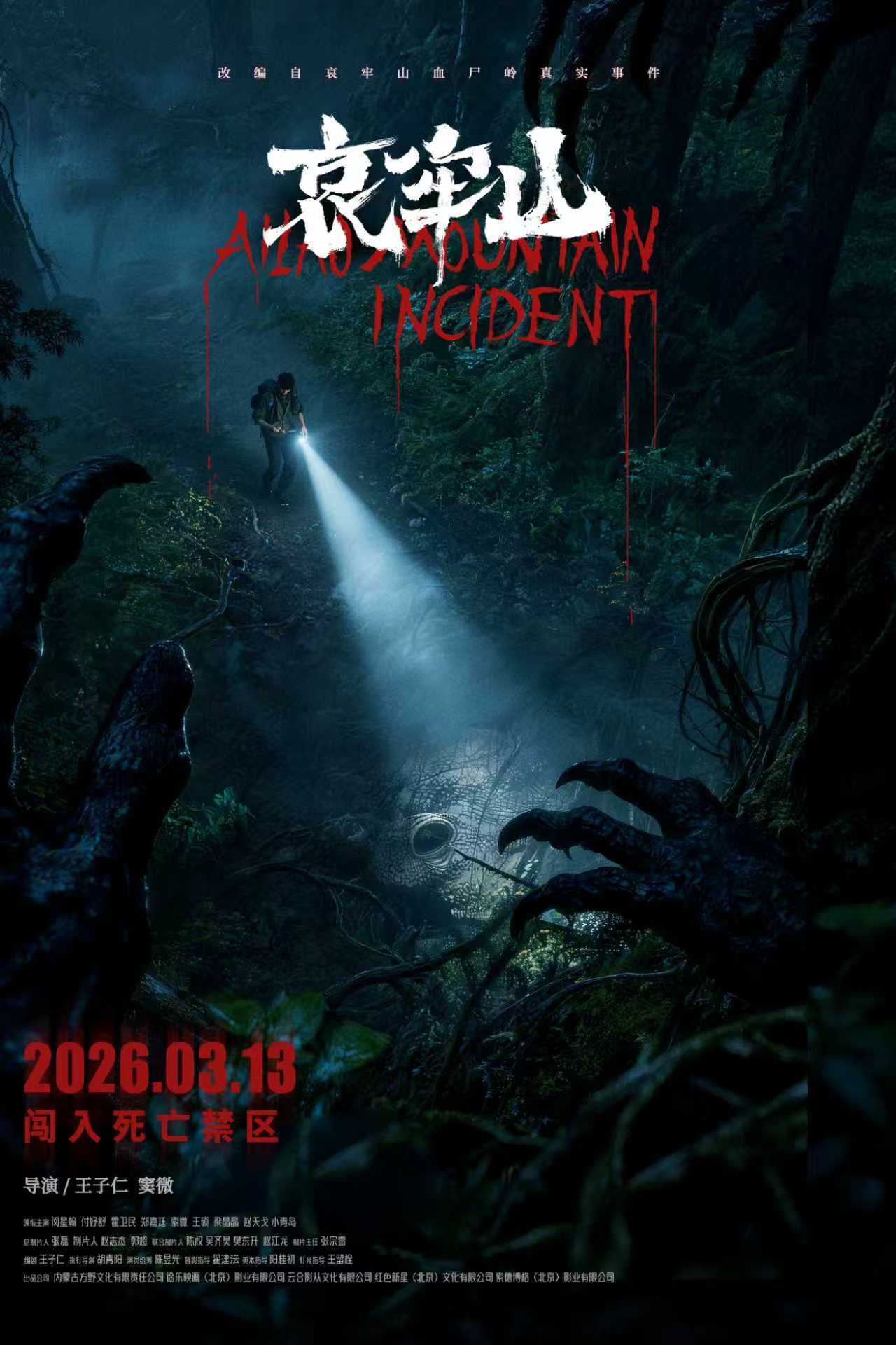 近日,由王子仁、窦微执导,闵星翰、付妤舒、霍卫民、郑嘉廷、索微、王硕、梁晶晶、赵天戈、小青岛等演员领衔主演的全新恐怖电影《哀牢山》发布“死亡禁区版”定档海报,正式官宣定档2026 年 3 月 13 日登陆全国院线。影片改编自轰动一时的哀牢山血尸岭真实事件,将这片原始森林中 “有进无出” 的死亡禁区搬上大银幕,以极致的中式恐怖美学带来一场深入骨髓的惊悚盛宴。