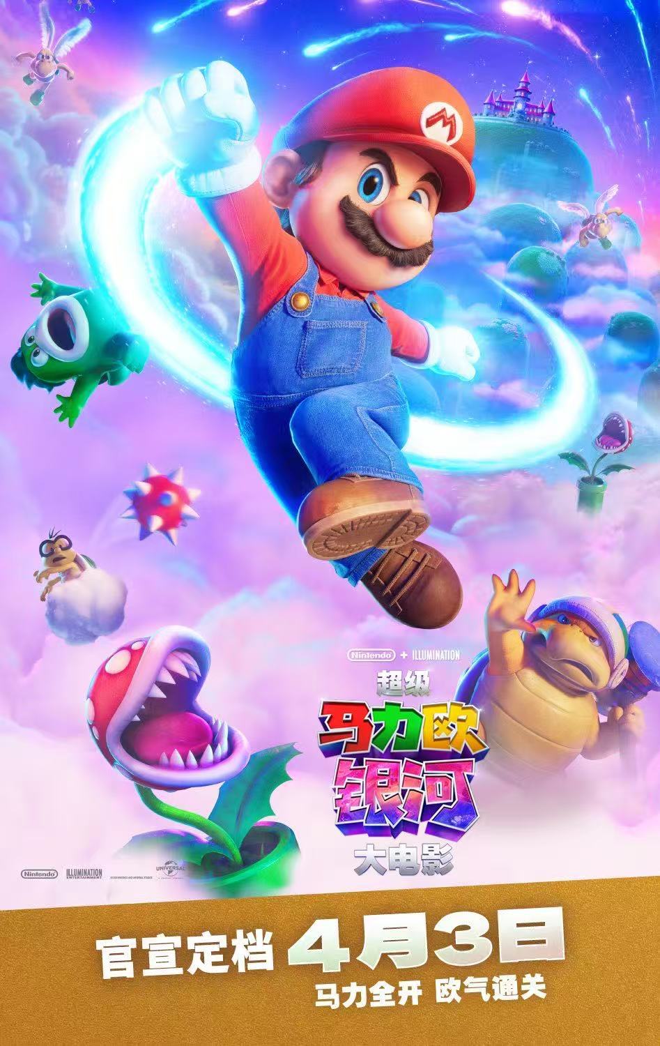 由照明娱乐打造的《超级马力欧银河大电影》定档4月3日!跃入浩瀚银河,马力欧、路易吉再启冒险,联手老朋友新伙伴,探索多元世界,马力全开迎战宇宙新危机!原班人马强势助阵,视听体验全面升级,《超级马力欧银河大电影》用欢笑与热血为你充能,4月3日共赴星际旅程!