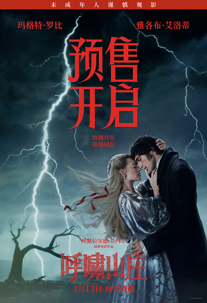由好莱坞巨星玛格特·罗比、雅各布·艾洛蒂领衔主演的电影版《呼啸山庄》(Wuthering Heights) 今日发布预售海报和预告,宣布正式开启预售。海报中,荒原之上电闪雷鸣,凯茜(玛格特·罗比 饰)与希斯克利夫(雅各布·艾洛蒂 饰)深情相拥。电影《呼啸山庄》改编自英国著名作家艾米莉·勃朗特的同名经典文学作品,埃默拉尔德·芬内尔执导,玛格特·罗比担任制片人。影片风格现代新锐,视觉呈现精致考究,原声配乐独具匠心,将为观众奉上一场震撼人心的视听盛宴,3月13日正式全国上映。