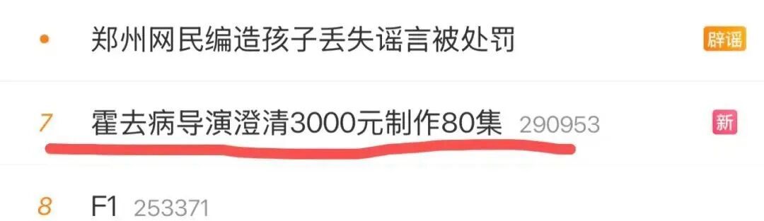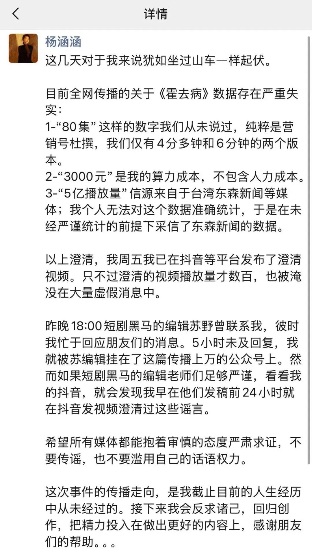 3月8日,“霍去病导演澄清3000元制作80集”登上微博热搜。当日凌晨2点,《霍去病》导演杨涵涵在朋友圈发文澄清,她提到全网传播的《霍去病》的数据严重失实:关于“80集”,其表示“这样的数字我们从未说过,纯粹是营销号杜撰,我们仅有4分多钟和6分钟的两个版本”;关于“3000元”,她提到这仅是算力成本;而“5亿播放量”,其表示“个人无法对这个数据准确统计”。