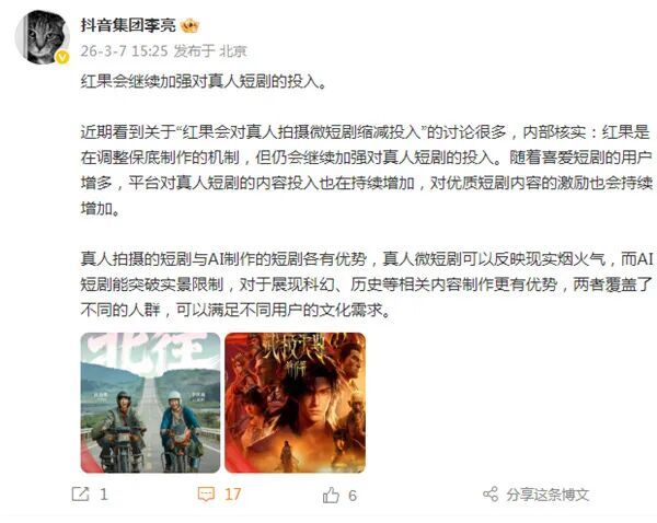 3月7日,抖音集团副总裁李亮发文,否认网传“红果会对真人拍摄微短剧缩减投入”的消息。他称“红果是在调整保底制作的机制,但仍会继续加强对真人短剧的投入。”同时,他还表示:”真人拍摄的短剧与AI制作的短剧各有优势,真人微短剧可以反映现实烟火气,而AI短剧能突破实景限制,对于展现科幻、历史等相关内容制作更有优势,两者覆盖了不同的人群,可以满足不同用户的文化需求。“