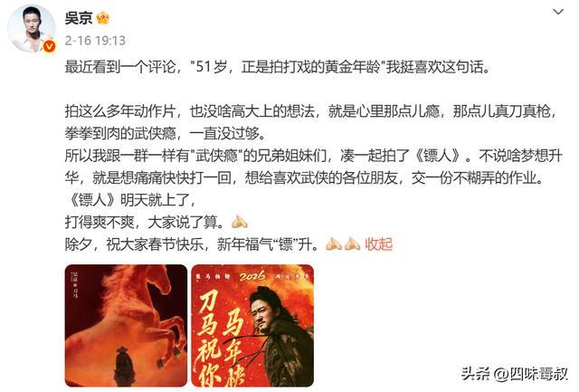 吴京在2月16日发文说:“我跟一群一样有‘武侠瘾’的兄弟姐妹们,凑一起拍了《镖人》。不说啥梦想升华,就是想痛痛快快打一回,想给喜欢武侠的各位朋友,交一份不糊弄的作业。”