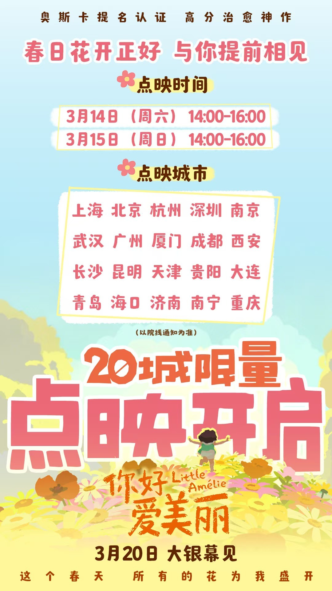 今日释出的“春日暖阳”海报中,爱美丽张开双臂平躺在大地上,沐浴阳光,眼里充满对于世界的好奇,和煦的春光也透露着影片温柔治愈的基调,令观众感受童真的纯粹与生命的美好。同步发布了导演迈利斯·瓦拉德、导演韩良畴给中国观众的独家问候视频,两位导演亲切地向内地观众问好,发出诚挚的观影邀约,映后隔空畅谈幕后创作趣事,一同度过一个惬意的春日午后。 3月14至3月15日,电影将在上海、北京、杭州、深圳、南京、武汉、广州、厦门、成都、西安、长沙、昆明、天津、贵阳、大连、青岛、海口、济南、南宁、重庆开启全国二十城限量点映,3月14日点映期间,北京、上海、深圳、杭州、广州、厦门、成都、武汉、南京、西安十城将举办映后连线活动,邀请知名主持人陈鲁豫与导演迈利斯·瓦拉德、导演韩良畴进行线上连线对谈。本周末走进影院享受一段温馨治愈的时光,与爱美丽一起迎接崭新春天吧!
