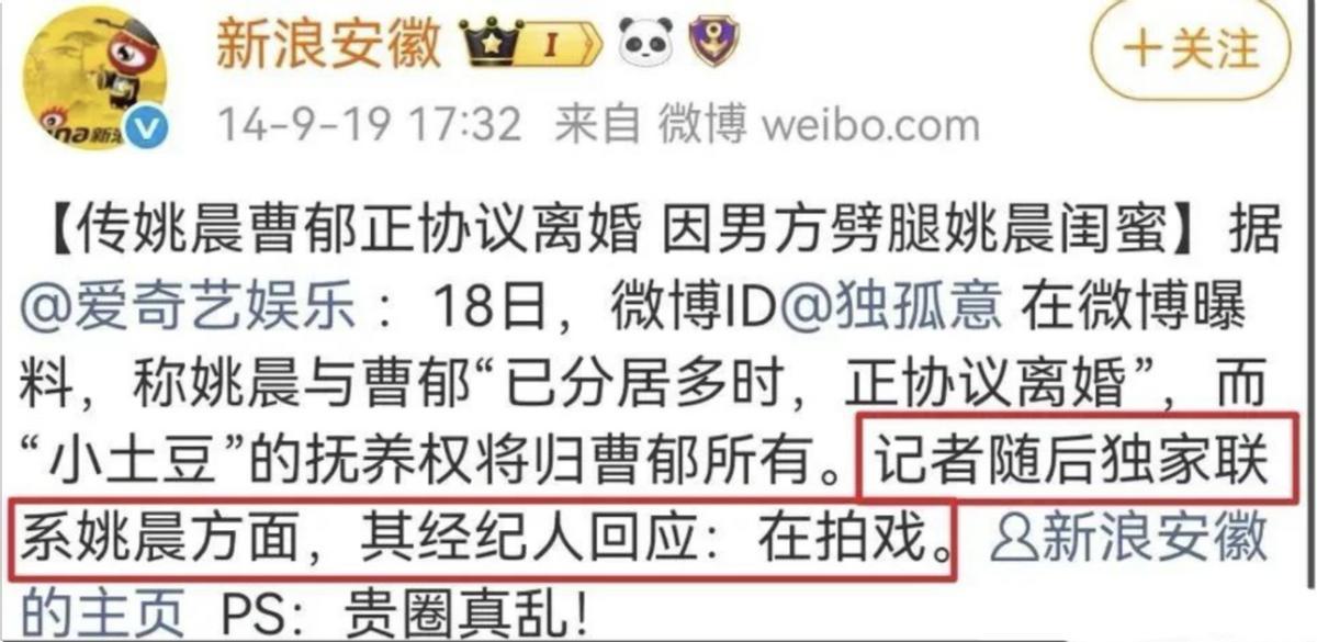 这边曹郁被造谣出轨,那边姚晨也不消停。