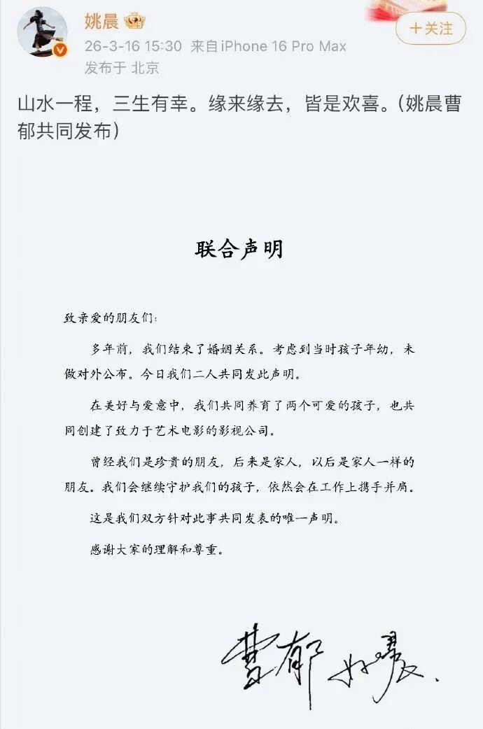 3月16日,姚晨与曹郁共同发布一纸声明,宣布离婚。