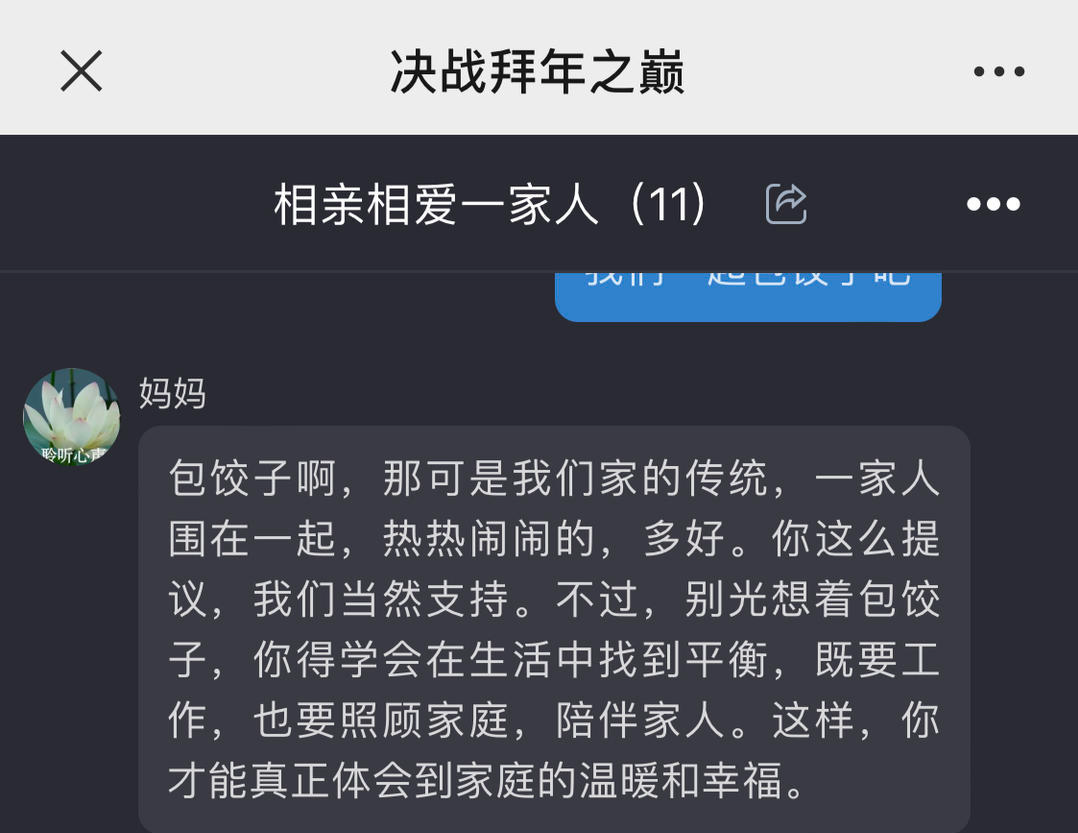 尽管在游戏里,陈女士无法对AI亲戚“有效回怼”,她还是尝试了其他“蒙混过关”的办法:“有时就干脆说谎,说我已经结婚、儿女双全、在家乡工作、年薪百万、正在修读博士学位……AI亲戚就会比较高兴。有时我实在不知道说什么,就转移话题。AI亲戚要给我介绍对象,我就说把我的同事介绍给他们的孩子。”