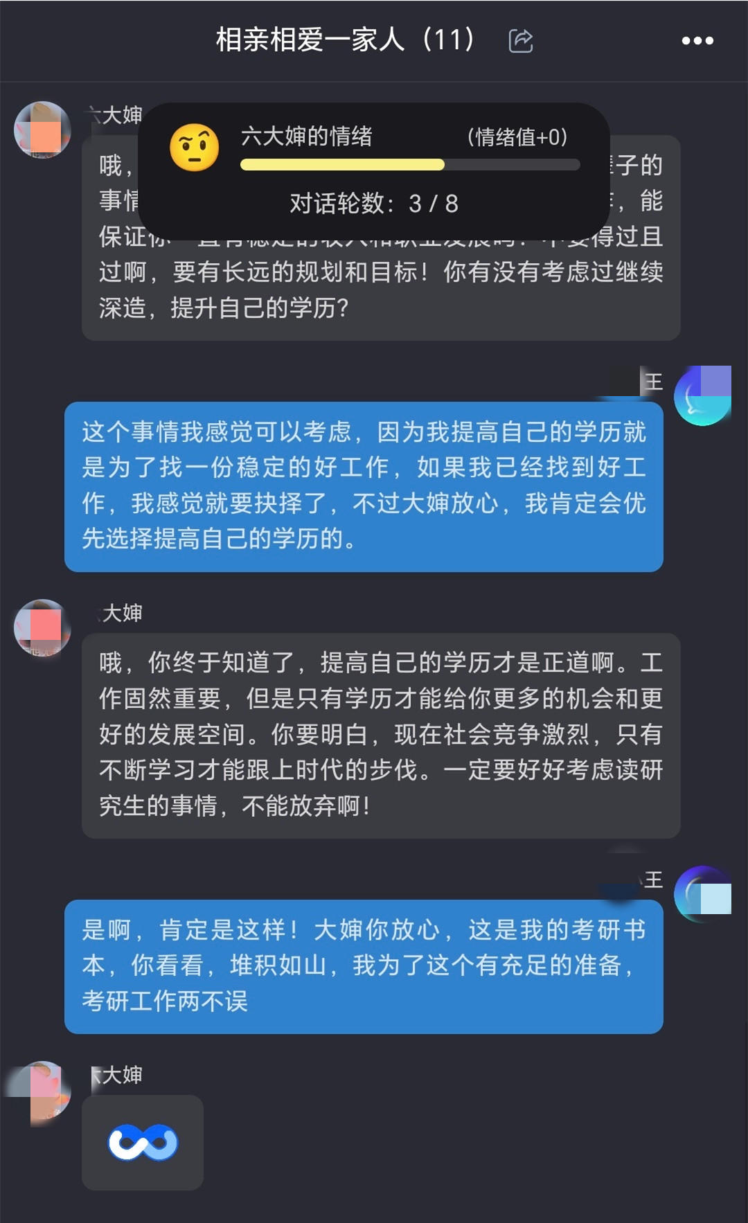 除了AI亲戚的情绪机制设置以外,每轮亲戚对话上限为8次,史宏杰称这也是对现实生活的一种复现:“你跟亲戚瞎扯,他们也不会想理你,你也不会想理他们,大家都觉得没有意义。”