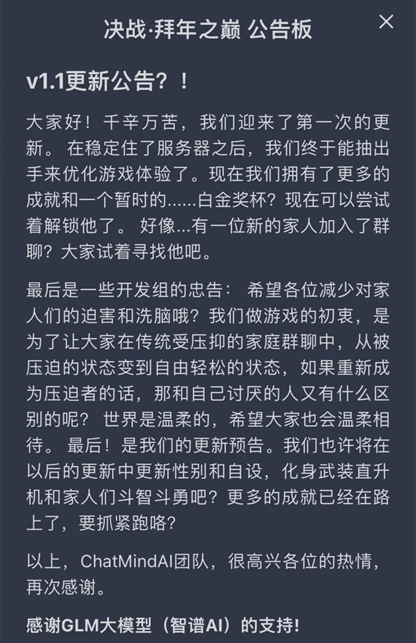 史宏杰透露,通关以后的结局文字已提前设置,比如,“其实大家家里的群聊都一样,大家没有很多针锋相对的东西,有的只是日复一日的互相应付和安慰。如果真的决战拜年之巅,也许没有人会是赢家。但再怎么刀子嘴,也要回家。”