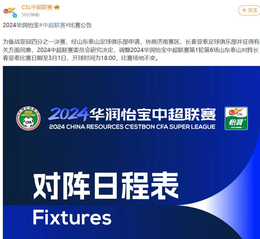 中超主办方称,“为备战亚冠四分之一决赛,经山东泰山足球俱乐部申请,协商济南赛区、长春亚泰足球俱乐部并征得有关方面同意,2024中超联赛委员会研究决定,调整2024华润怡宝中超联赛第1轮第6场山东泰山对阵长春亚泰比赛日期至3月1日,开球时间为18:00,比赛场地不变。”