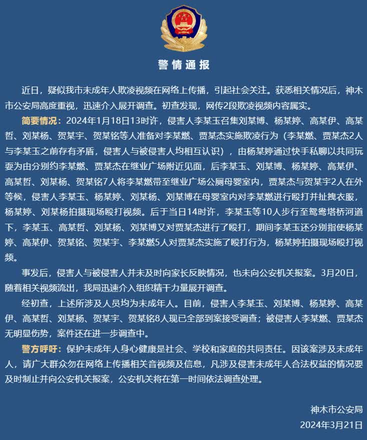 近日,疑似我市未成年人欺凌视频在网络上传播,引起社会关注。获悉相关情况后,神木市公安局高度重视,迅速介入展开调查。初查发现,网传2段欺凌视频内容属实。