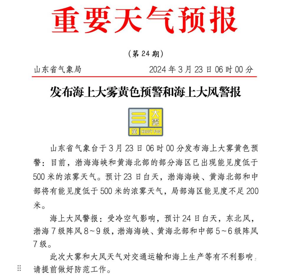 海上大风警报:受冷空气影响,预计24日白天,东北风,渤海7级阵风8~9级,渤海海峡、黄海北部和中部5~6级阵风7级。