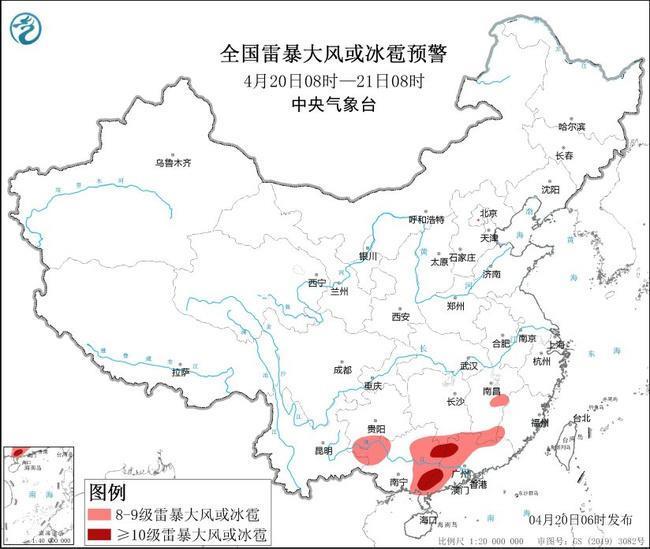 预计4月20日08时至21日08时,湖南南部、江西中南部、福建南部、贵州西南部、云南东南部、广西中东部、广东北部和中西部等地的部分地区将有8-10级雷暴大风或冰雹天气,其中广西东部、广东西部等地的部分地区将有10级以上雷暴大风,局地风力可达11级以上;湖南南部、江西南部、福建西部、贵州南部、云南东部、广西、广东中西部等地的部分地区将有小时雨量大于20毫米的短时强降水天气,其中广西东部和西北部、广东中西部等地的部分地区最大小时雨量大于50毫米,局地可达80毫米以上。