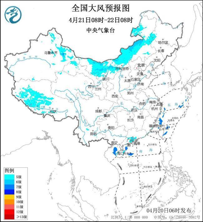 预计,4月20日08时至21日08时,新疆东部、甘肃西部、内蒙古北部等地的部分地区有5~6级、阵风7~8级的大风;黄海东南部海域、东海北部海域将有7~8级、阵风9级的大风。