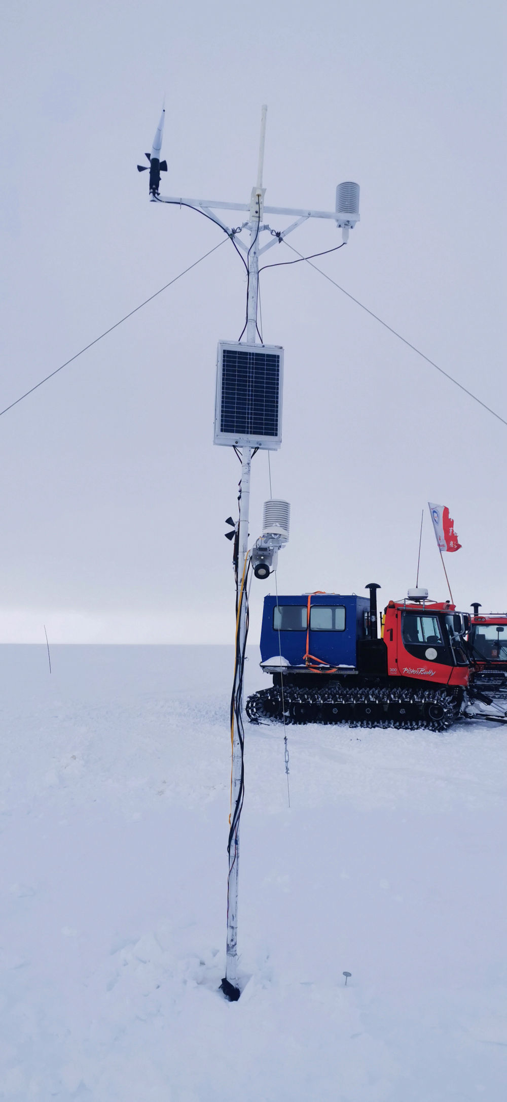 中国第40次南极考察队员在麒麟冰下湖的冰面架设气象站。新华社发(李传金摄)