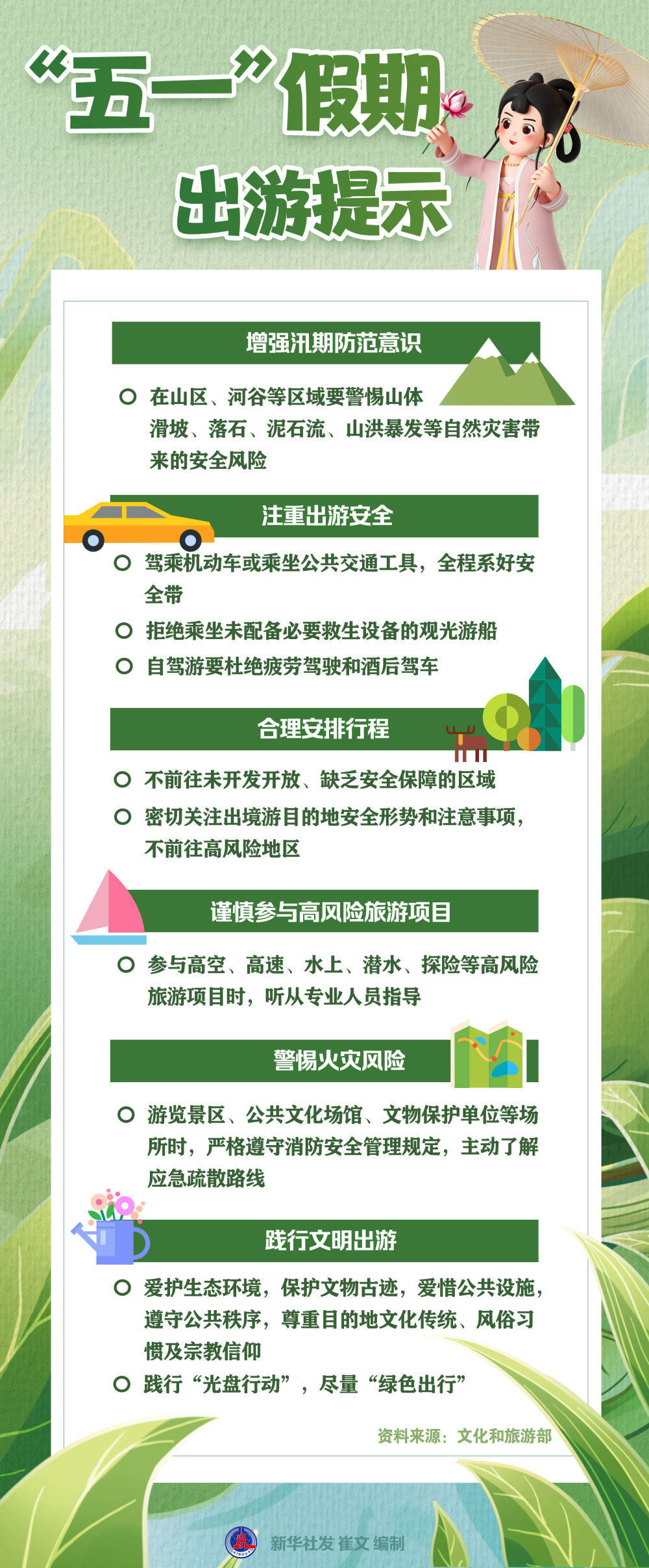 文化和旅游部近日发布“五一”假期出游提示,提醒广大游客增强汛期防范意识、注重出游安全、合理安排行程、谨慎参与高风险旅游项目、警惕火灾风险、践行文明出游。
