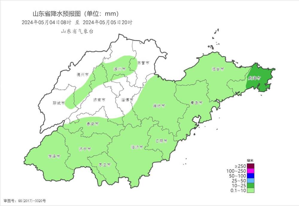 齐鲁网·闪电新闻5月3日讯 山东省气象台今天16时发布降雨预报,受高空槽影响,预计4—5日,山东自西向东有一次小雨过程,全省过程平均降水量2毫米左右。其中,菏泽、济宁、枣庄、临沂、日照、泰安、潍坊、青岛、烟台和威海1~5毫米,局部超过10毫米,其他地区0~3毫米。