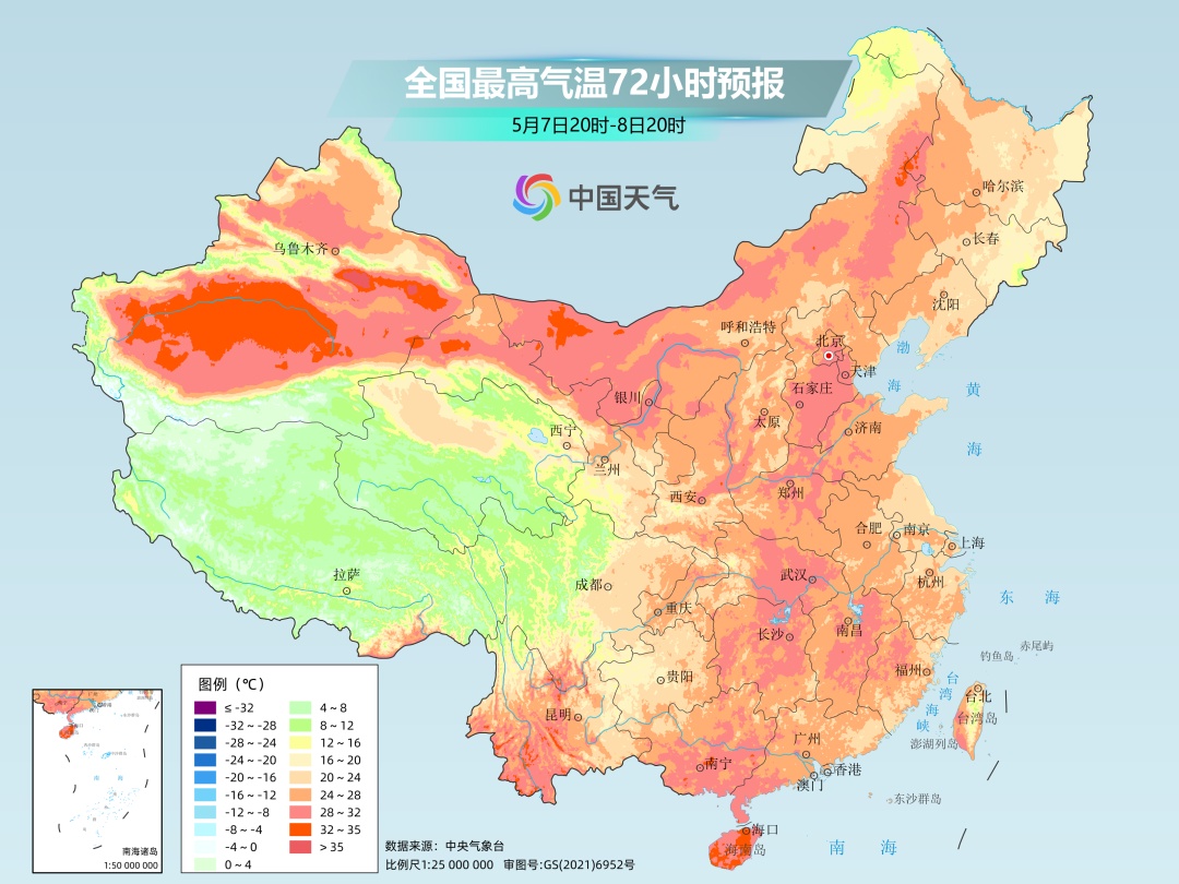 ▲图中北方那些亮橙色区域一些地方的最高气温将接近35℃,可能热到中暑不是玩笑……