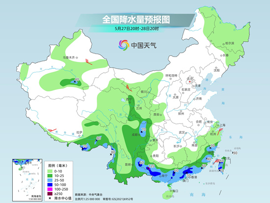 中央气象台预计,今天夜间至28日,广西、广东、湖南、江西、福建及贵州南部、浙江南部、江苏南部等地的部分地区有暴雨,局地大暴雨;受孟加拉湾风暴外围云系影响,云南西部、西藏东南部等地部分地区有明显降雨。