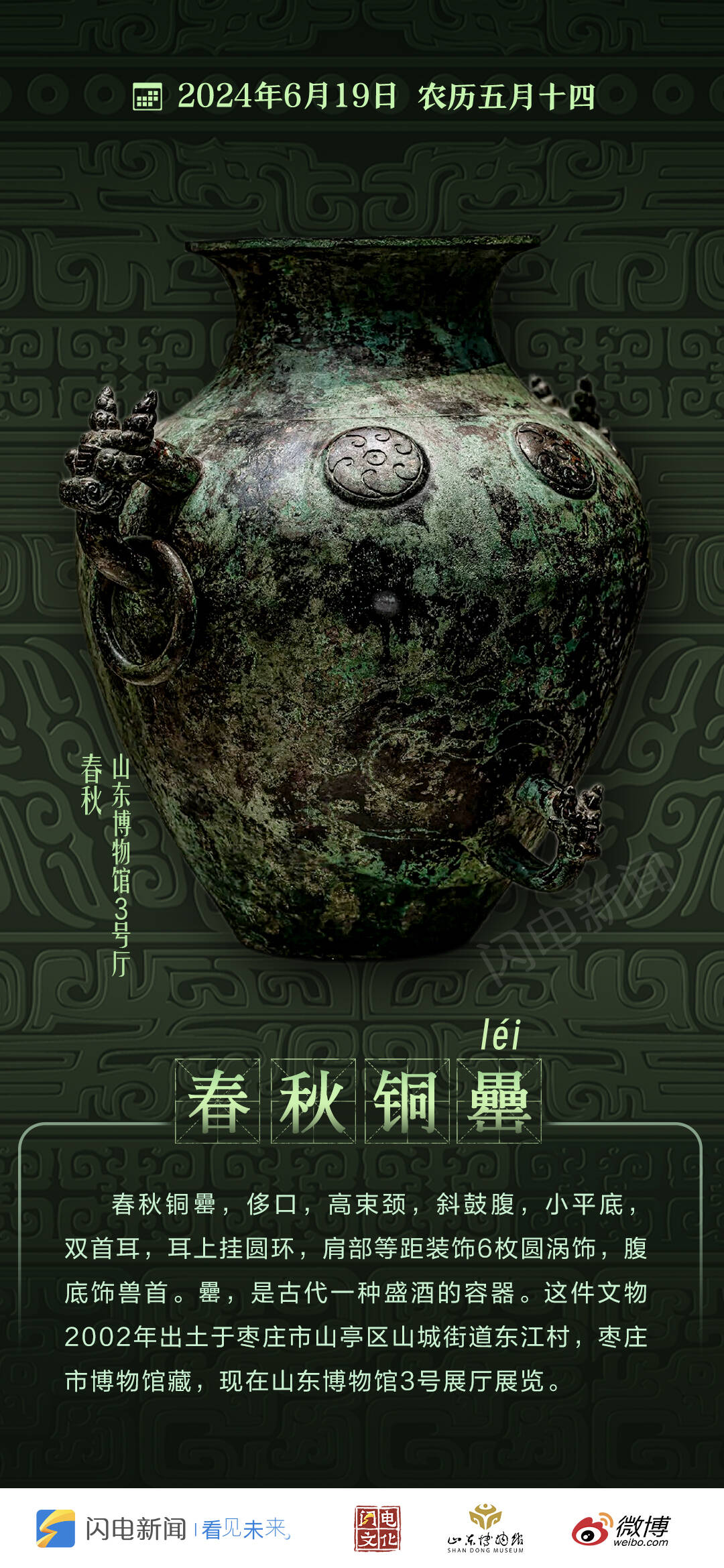 今天带大家来看“春秋铜罍”。罍,是古代一种盛酒的容器。春秋铜罍,侈口,高束颈,斜鼓腹,小平底,双首耳,耳上挂圆环,肩部等距装饰6枚圆涡饰,腹底饰兽首。这件文物2002年出土于枣庄市山亭区山城街道东江村,枣庄市博物馆藏,现在山东博物馆3号展厅展览。