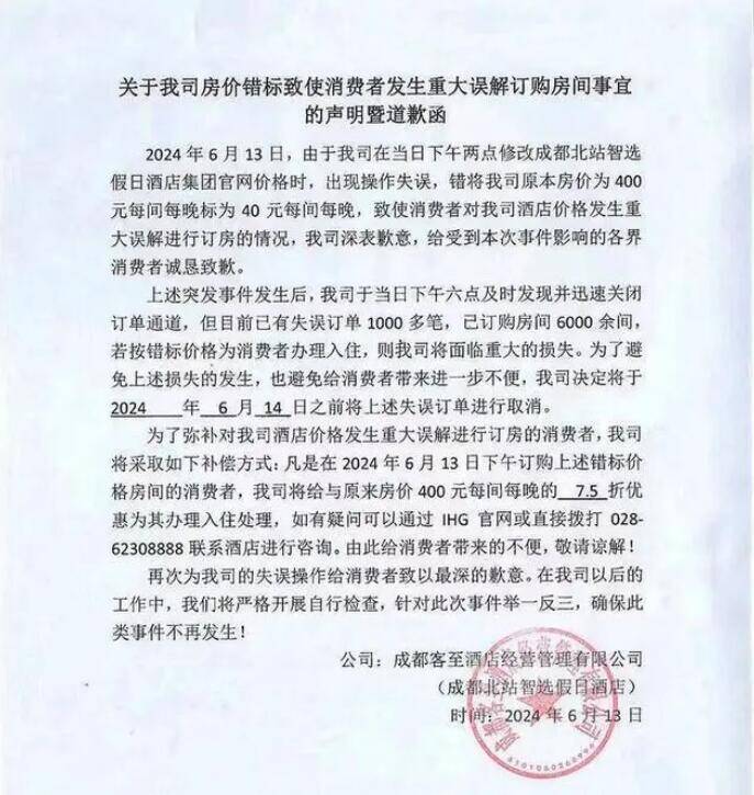齐鲁网·闪电新闻6月19日讯 近日,有多名消费者反映,自己预订的某酒店被强制退单。根据酒店发来的声明称:因工作人员操作失误,错将原本房价400元每间每晚标为40元每间每晚,导致目前已有失误订单一千多笔,已订购房间6000余间。若按错标价格办理入住,酒店将面临极大损失,于是决定取消失误订单,并且采取原房价7.5折优惠的补偿处理。但是,部分消费者表示并不接受酒店在没有任何提前通知、任何交涉商量的情况下擅自取消订单的行为,要求按照原订单入住。