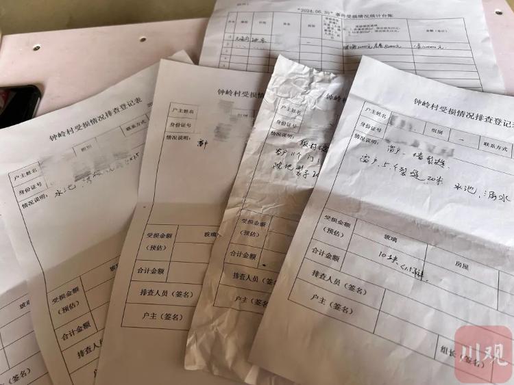 钟岭村石榴院的房屋受损情况填报更加细致。7月1日,石榴院村民小组组长挨家挨户通知、进行纸质填报,要求各家填好个人信息、房屋受损情况、受损金额预估等。