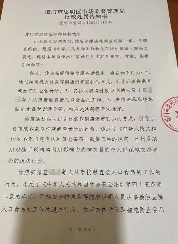 涉事店铺“帅帅鲜餐饮店”法定代表人师新帅表示,他平时在修车,这家店铺今年2月份才开业,主要是其他股东在负责运营,对于店铺和司机之间的“消费回扣”情况不太了解,7月8日收到这张处罚告知书。
