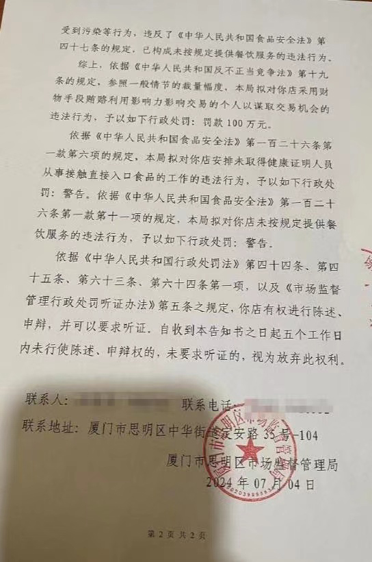 思明区市场监督管理局工作人员证实了确实存在上述告知书。他表示,“这是行政处罚告知书,还不是决定书。目前案子还未办结,还处于听证阶段。”对于更多的案件情况,该工作人员表示,商家有申诉的权利,但案件具体情况不方便细说。