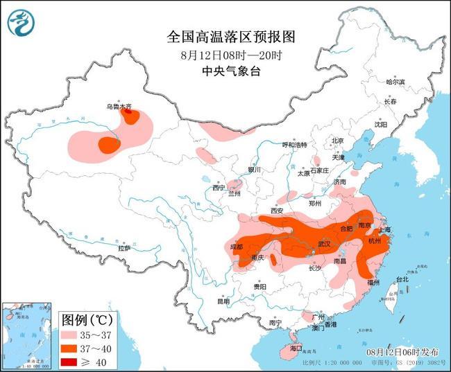 预计8月12日白天,新疆吐鲁番盆地和南疆盆地东部、内蒙古西部、甘肃中西部、陕西南部、四川盆地、重庆以及黄淮南部、江淮、江汉、江南北部和中东部等地有35℃以上的高温天气,其中,吐鲁番盆地和南疆盆地东部、陕西南部、重庆、四川盆地东部、安徽中南部、江苏西南部、湖北、湖南北部、江西北部、浙江、福建北部等地的部分地区最高气温仍有37℃以上,局地可达40℃左右。